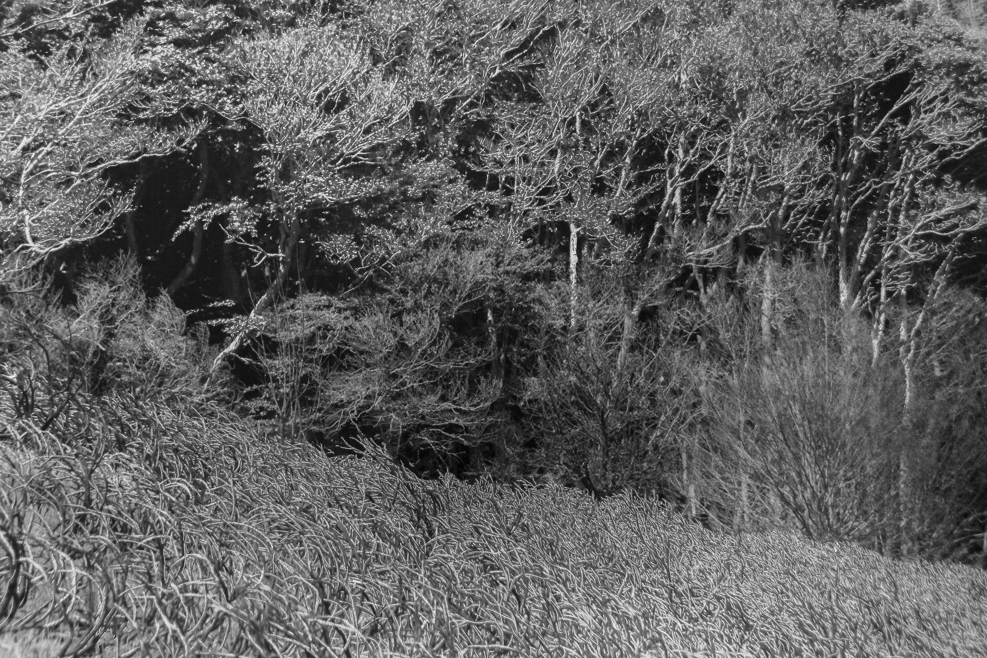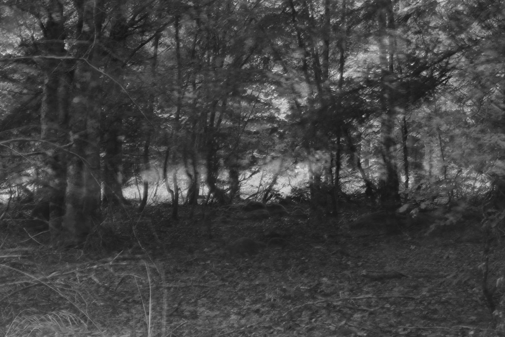 La forêt de l’Aigoual, dans sa complexité — futaies irrégulières, essences multiples, régénération spontanée — nous invite à un déplacement de nos cadres perceptifs. Elle désorganise toute posture d’observation distanciée. Y pénétrer, c’est être immergé, encerclé. La profusion végétale sature les images, déborde les limites du cadre, bouche la perspective. L’enchâssement infini de ses niveaux d’interaction nous renvoie à l’altérité radicale des formes de vie végétale et nous impose, par la même occasion, à une révision de nos gestes plastiques. La forêt nous met au défi de nous frayer de nouveaux chemins dans nos manières de faire, de fabriquer de la photographie.